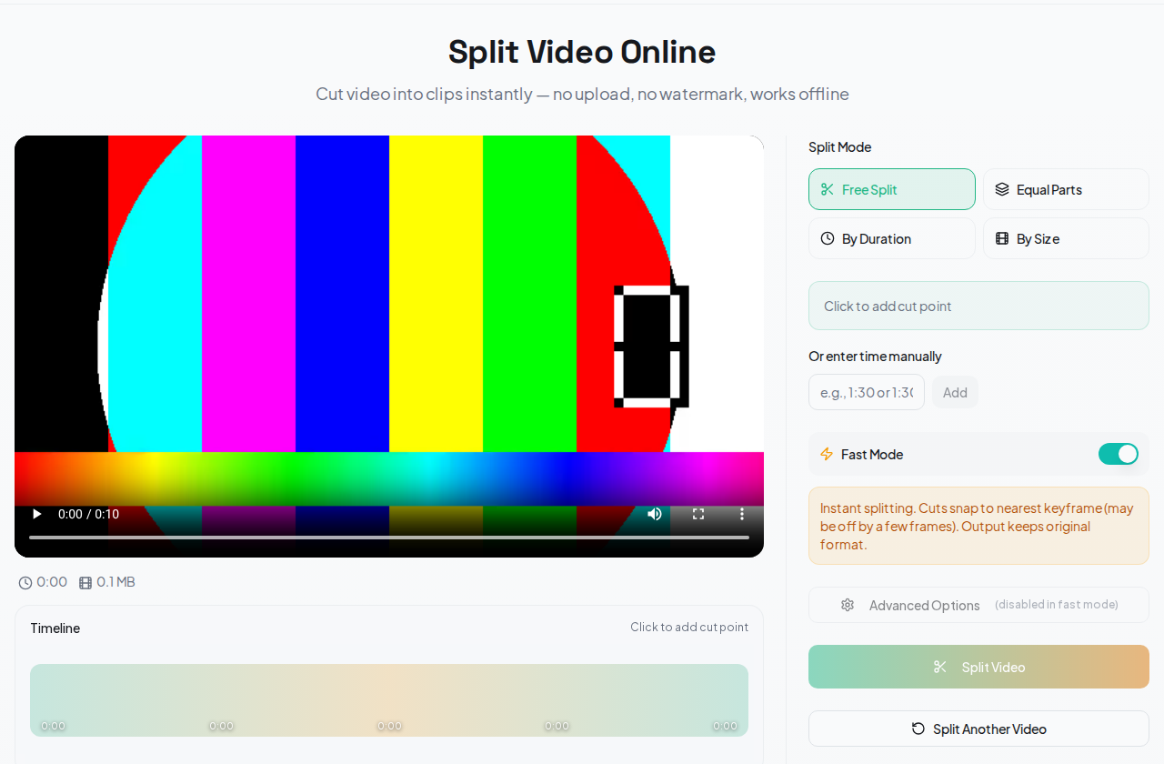 Fast Mode splits instantly by cutting at keyframes without re-encoding. The output keeps the original quality and format. Cut points may snap to the nearest keyframe, which could be a few frames off from your chosen time.